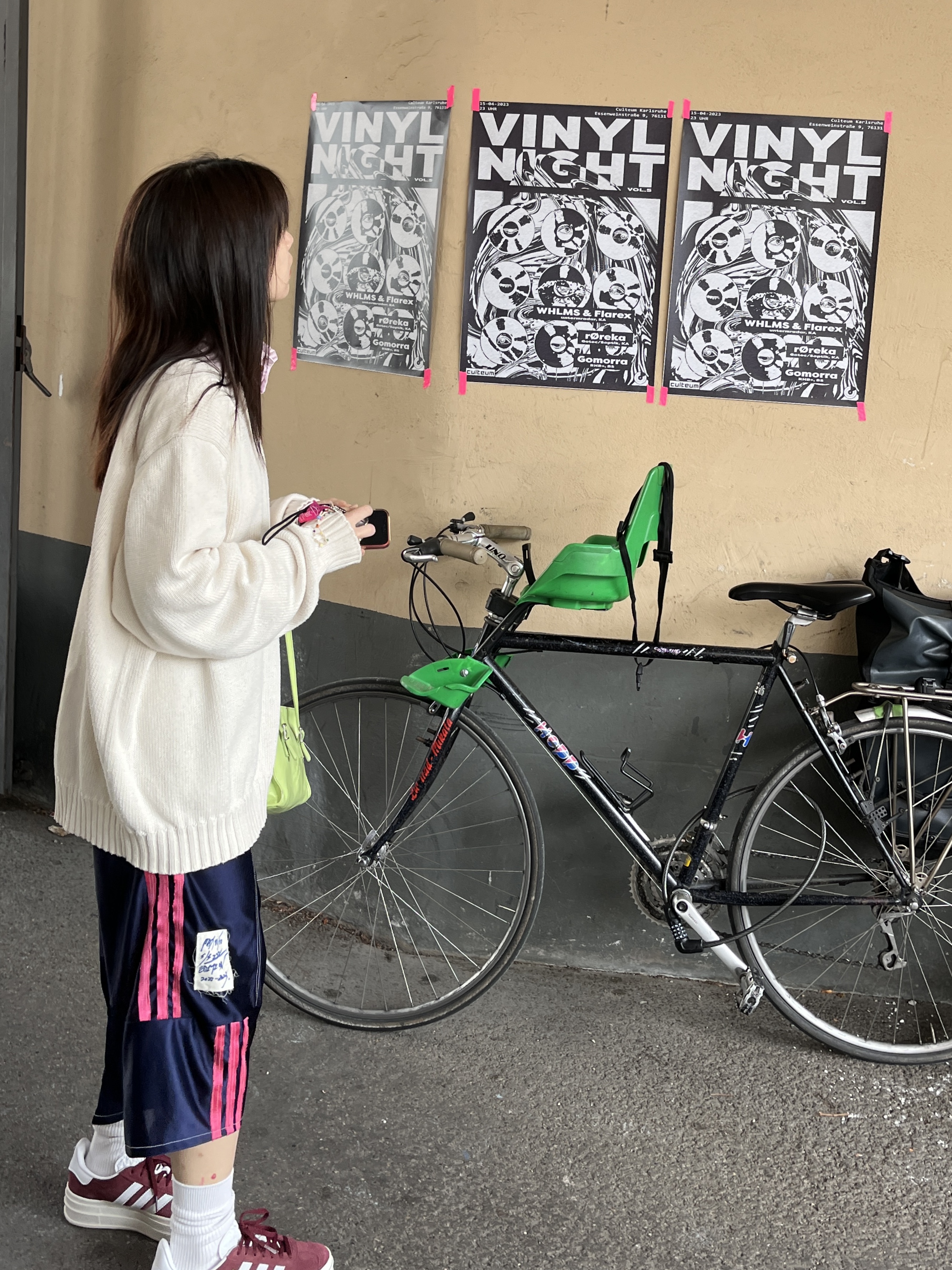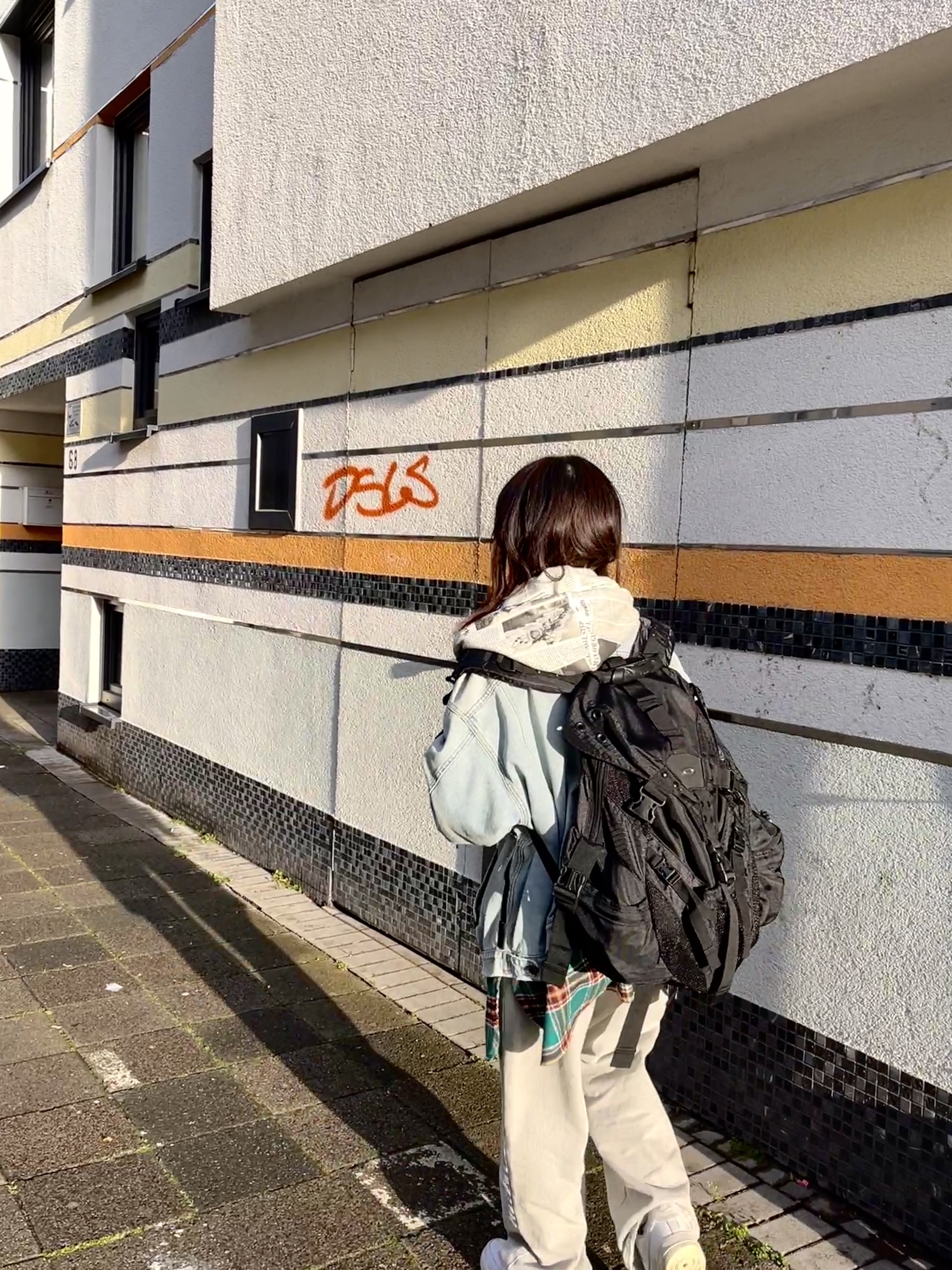 오렌지 색. 머쨍이 외벽 앞에 칼스루에 쿨걸. 사진 막 찍어 다 찍어.